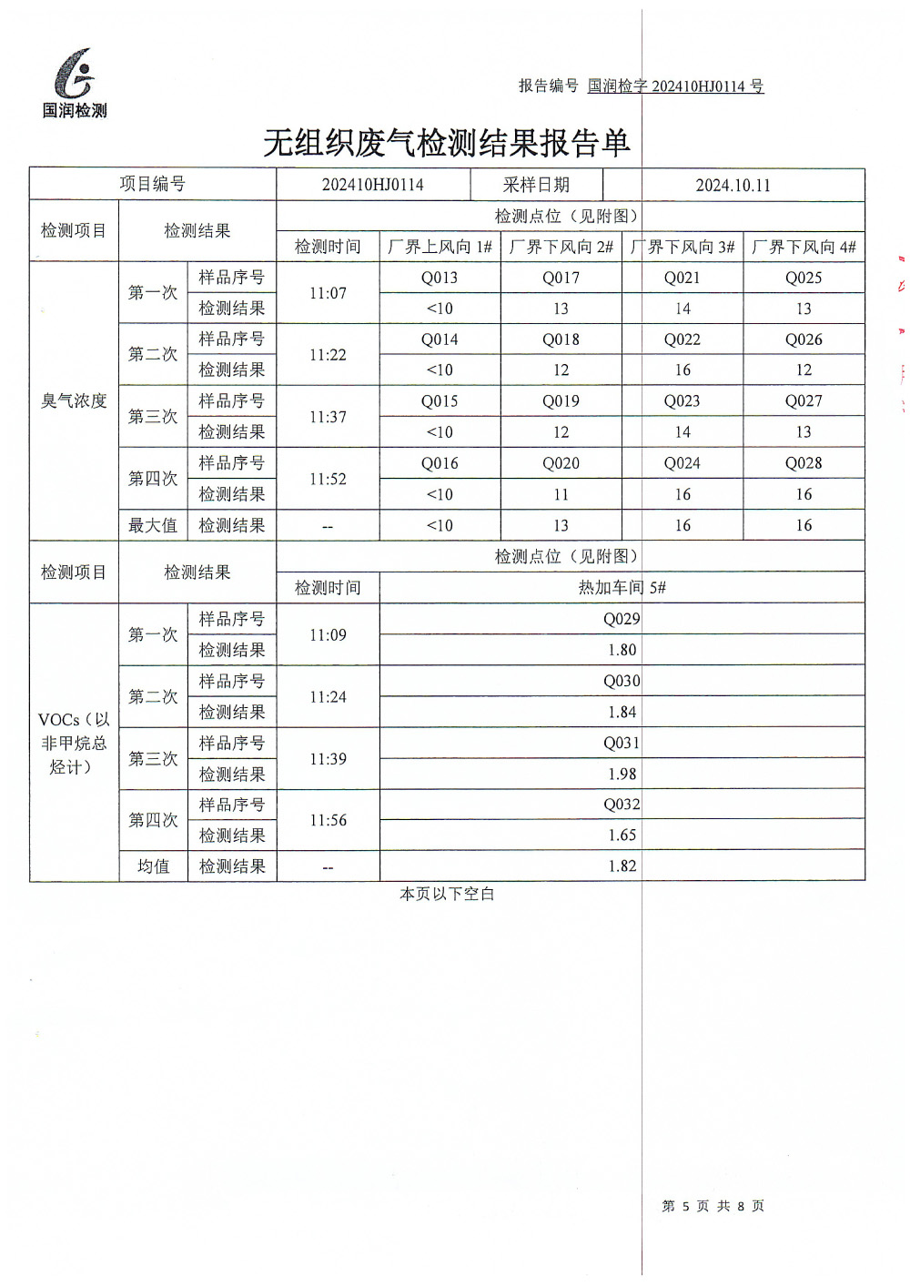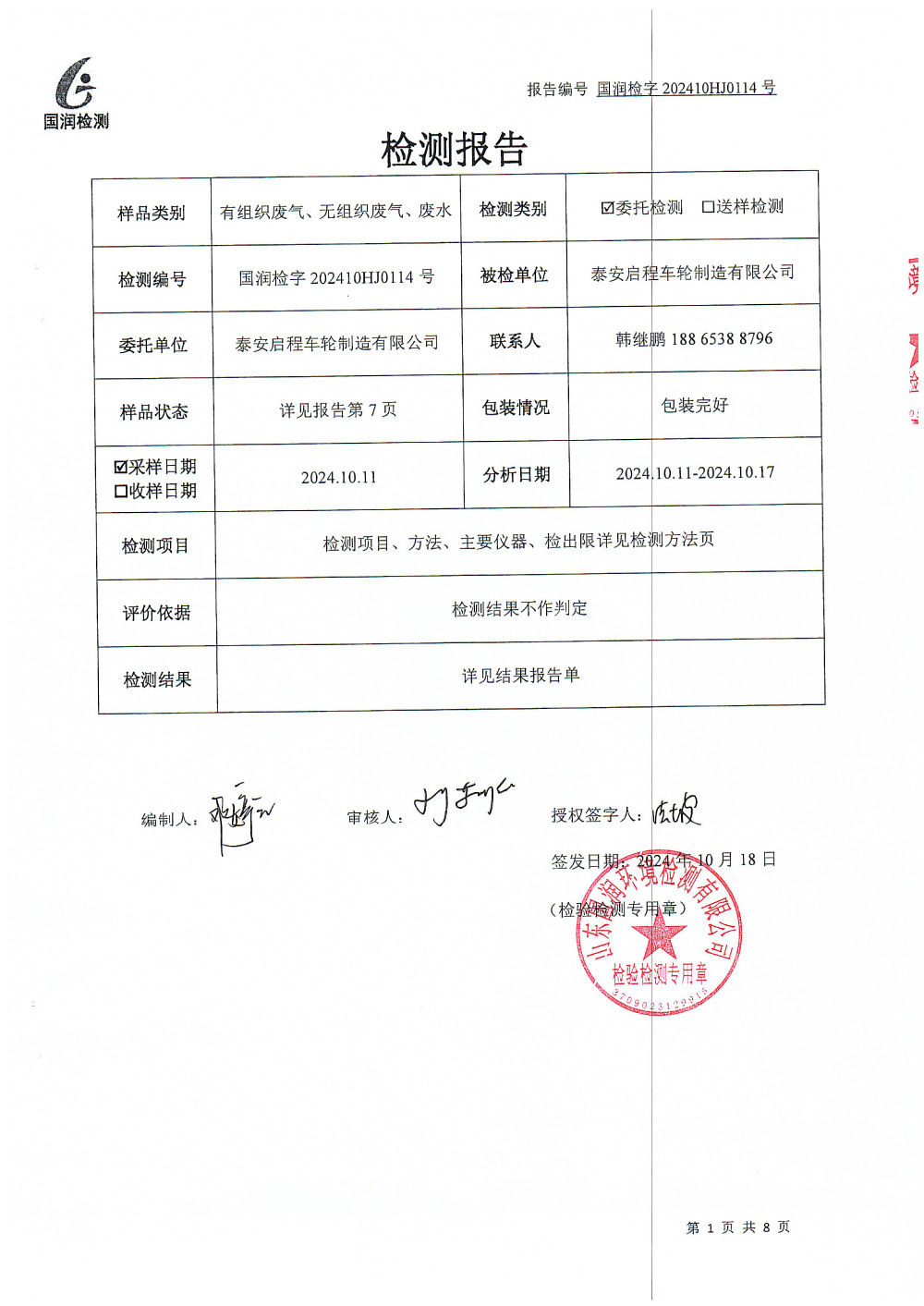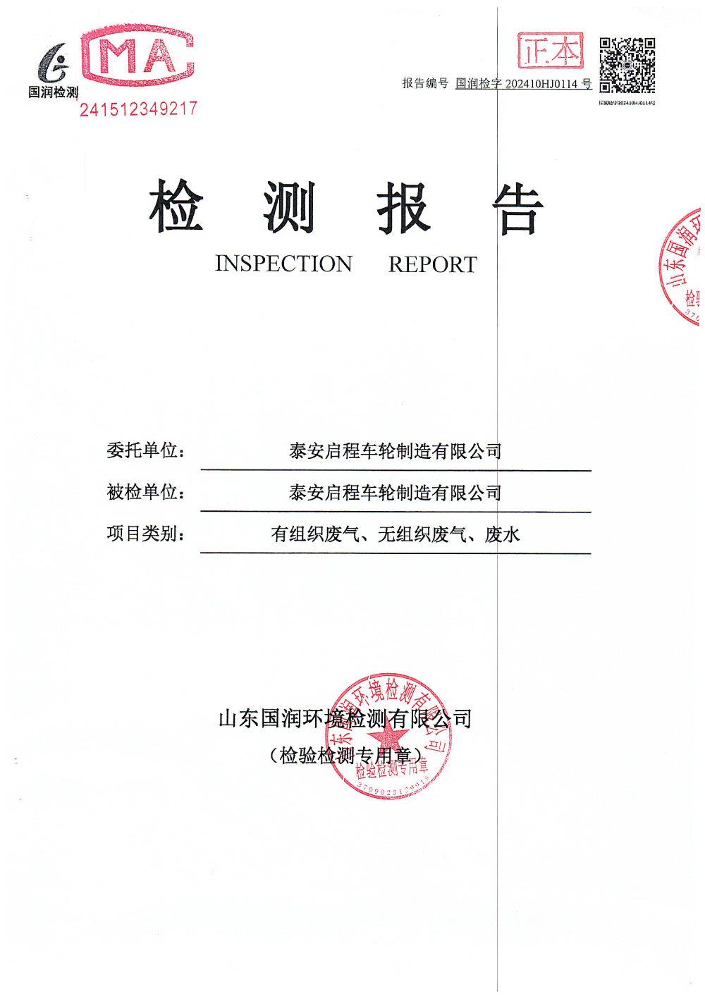 泰安啟程車輪制造有限公司2024年10月份環(huán)境污染物排放檢測報告