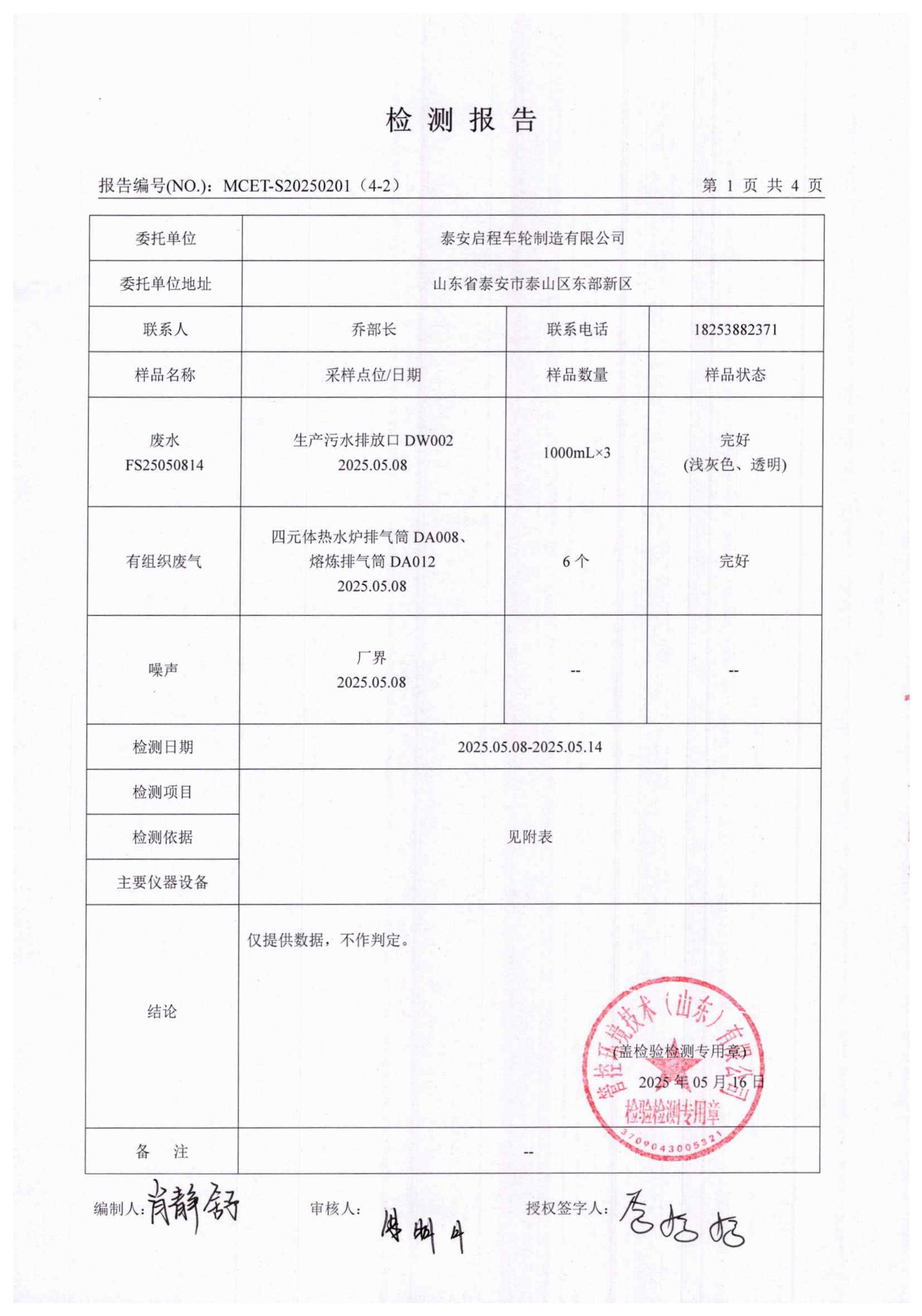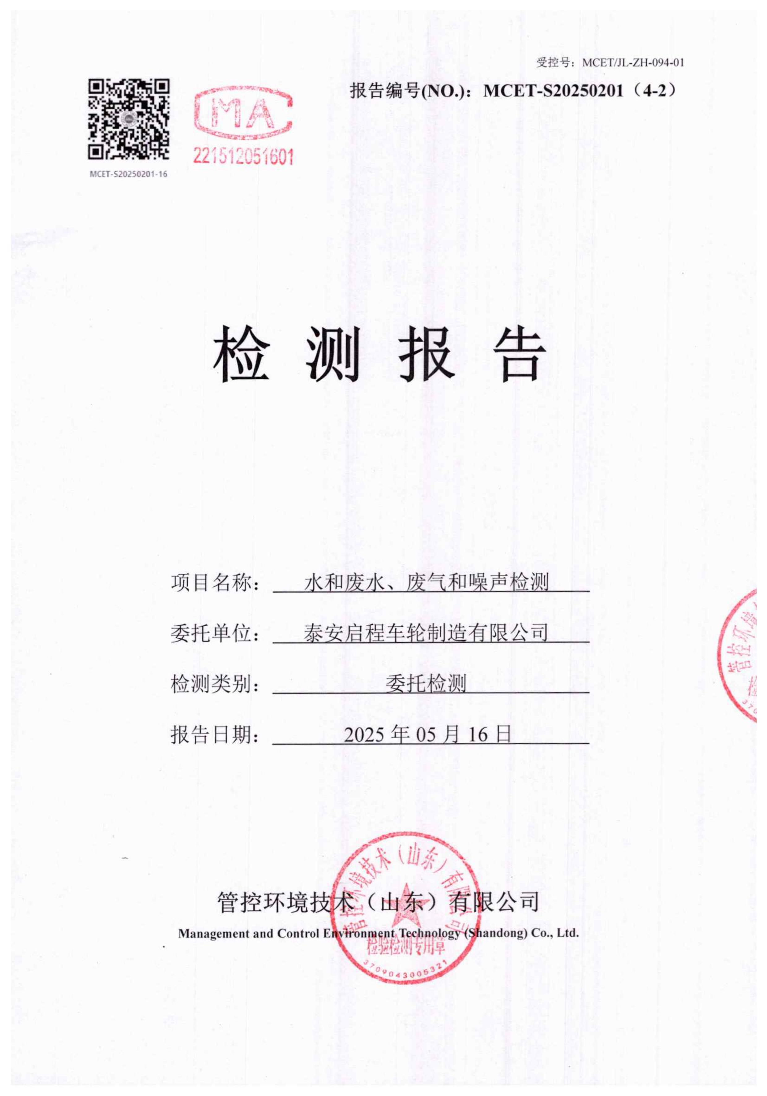 泰安啟程車輪制造有限公司2025年5月份環(huán)境污染物排放檢測報告