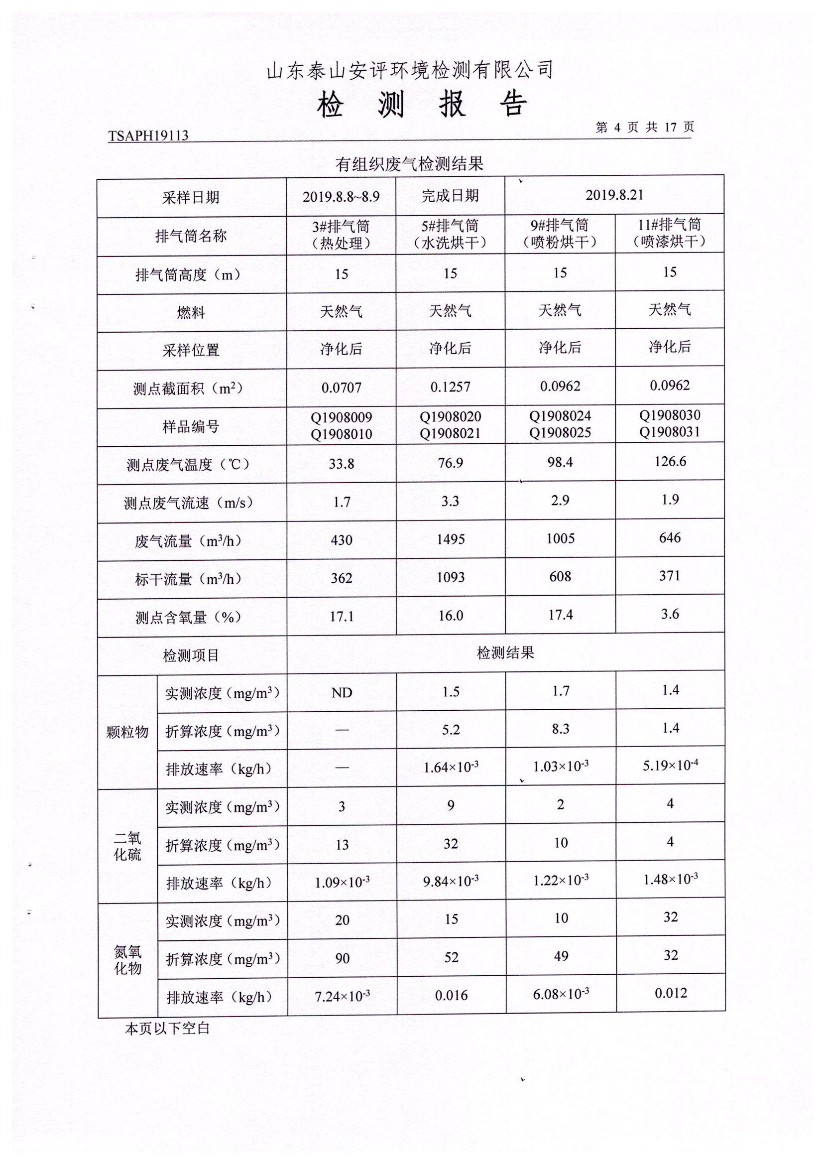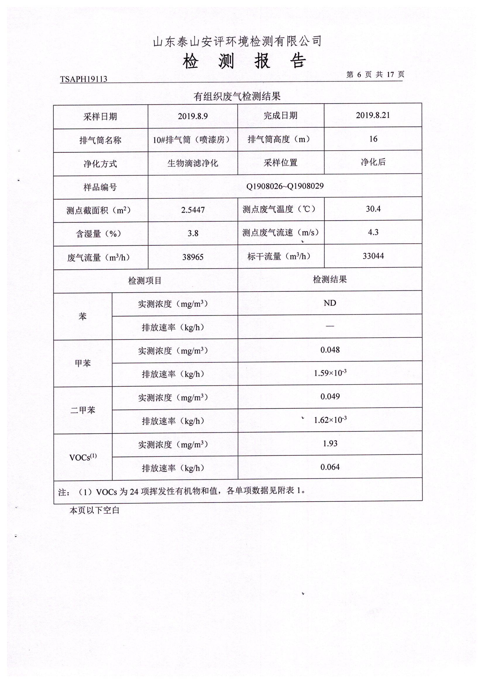 啟程公司主要廢氣排放口位于廠區(qū)北側(cè)和南側(cè):北側(cè)編號DA001/ DA002,執(zhí)行《山東省區(qū)域性大氣污染物綜合排放標(biāo)準(zhǔn)》(DB37/ 2376—2019)標(biāo)準(zhǔn): SO2≤50 mg/ m3,Nox≤100mg/ m3,顆粒物≤10mg/ m3。實際排放濃度:SO2 4mg/ m3,Nox 10mg/ m3,顆粒物 5.4mg/ m3。南側(cè)編號DA010,,執(zhí)行《揮發(fā)性有機(jī)物排放標(biāo)準(zhǔn)第5部分: 表面涂裝行業(yè)》(DB37 2801.5—2018)表2標(biāo)準(zhǔn): 苯≤0.5mg/ m3,甲苯≤1.5mg/ m3,二甲苯≤5mg/ m3,VOCs≤50mg/ m3。實際排放濃度:苯ND(未檢出),甲苯≤0.049mg/ m3,二甲苯≤0.048mg/ m3,VOCs≤1.93mg/ m3。廢氣排放均經(jīng)過處理設(shè)施有組織排放。