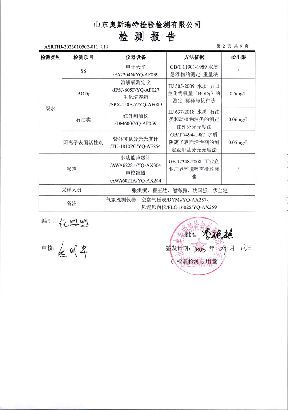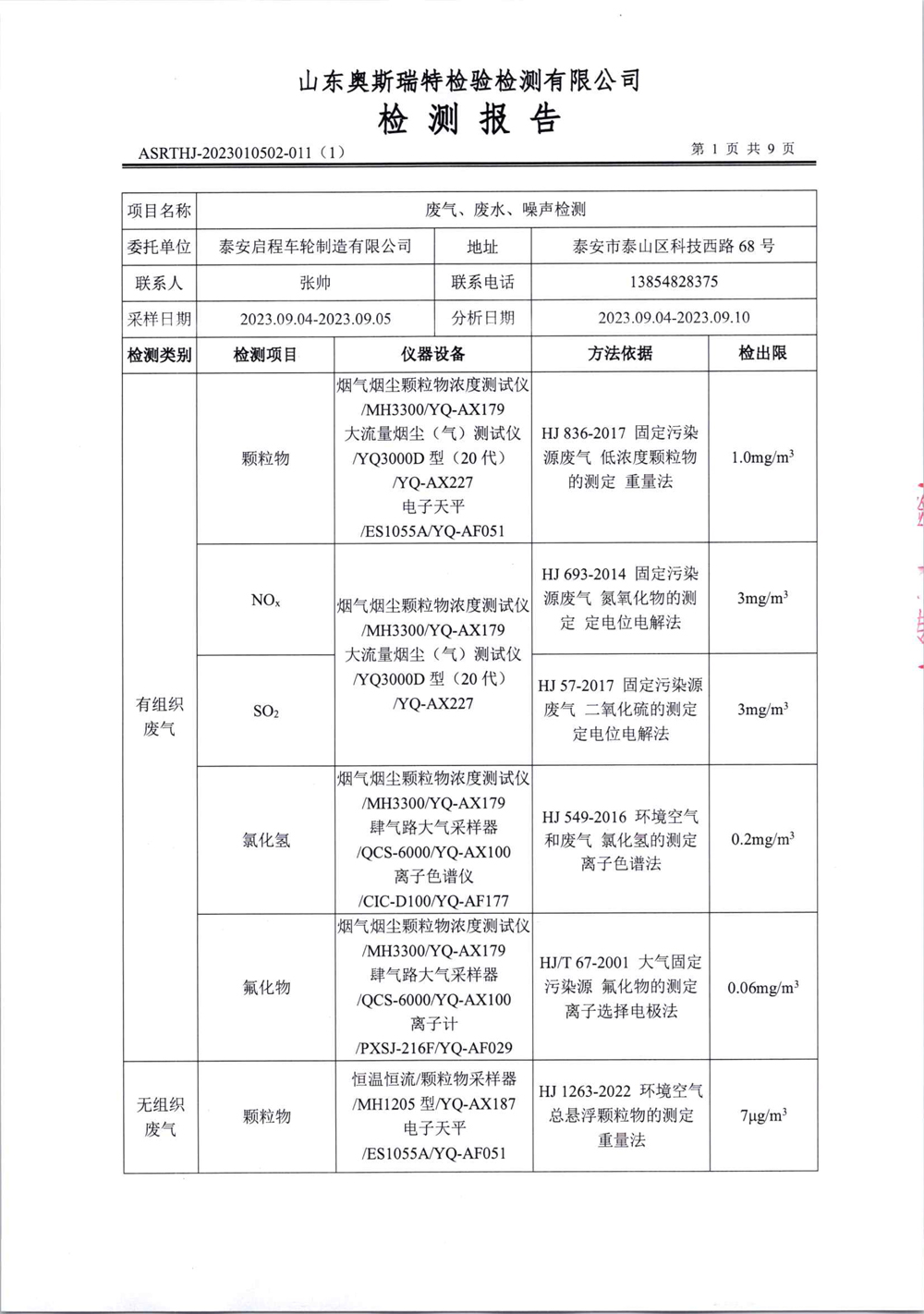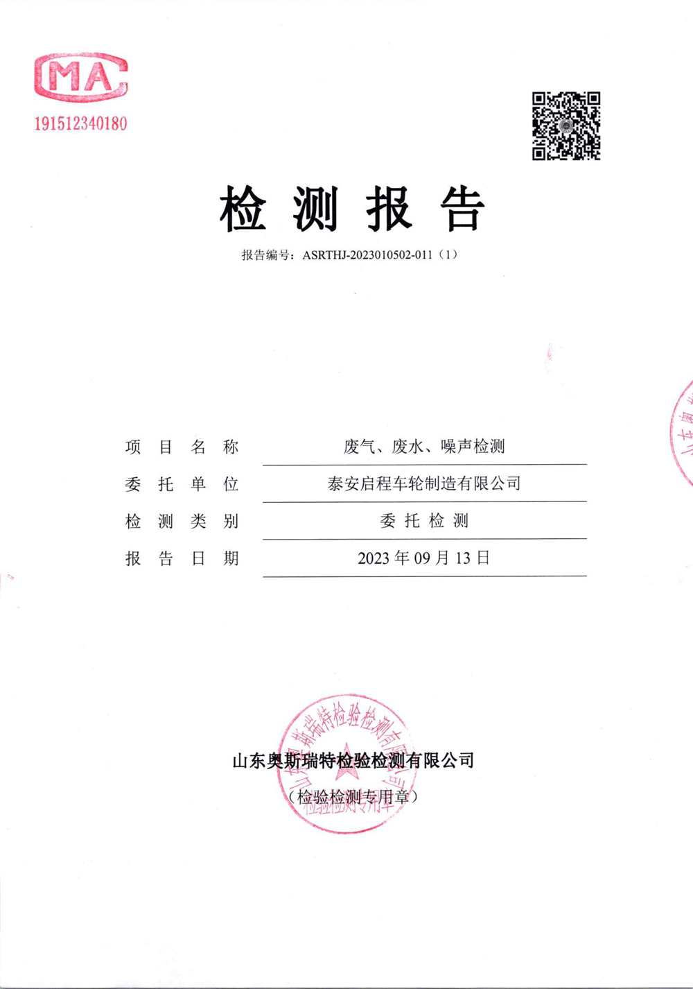 泰安啟程車輪制造有限公司2023年9月份環(huán)境污染物排放檢測(cè)報(bào)告