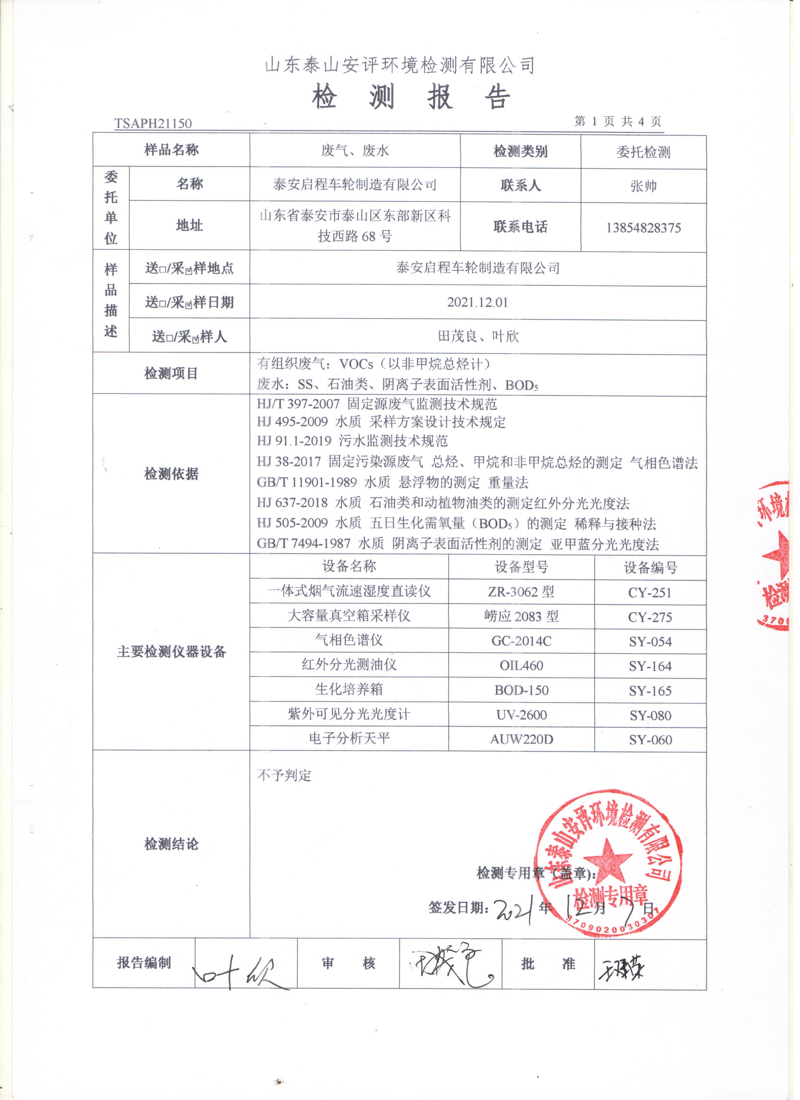 泰安啟程車輪制造有限公司2021年12月份環(huán)境污染物排放檢測(cè)報(bào)告