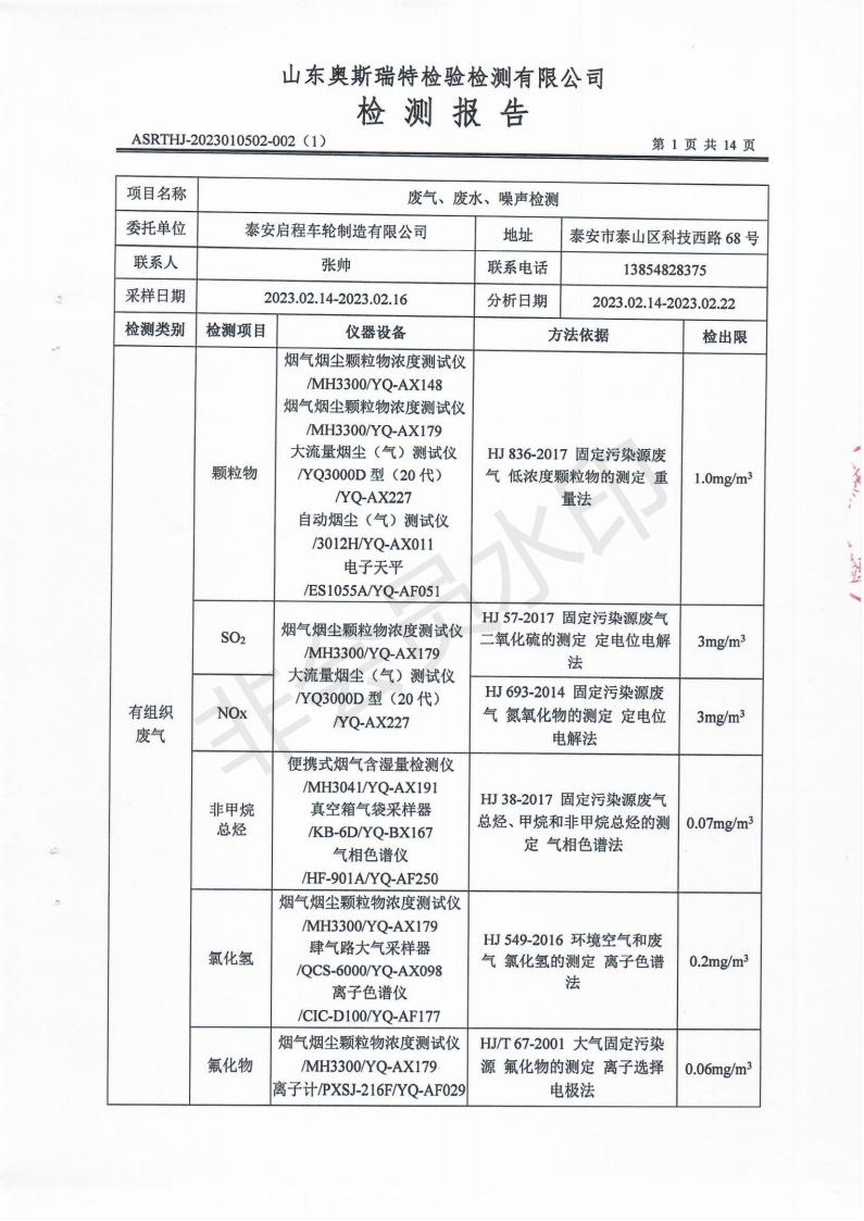 泰安啟程車輪制造有限公司2023年2月份環(huán)境污染物排放檢測報告