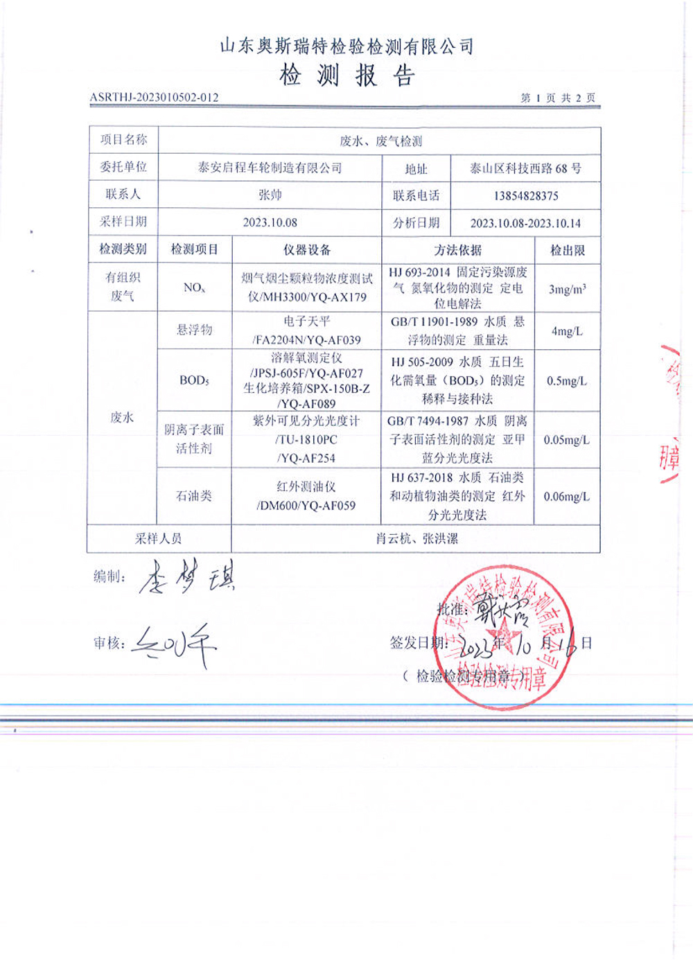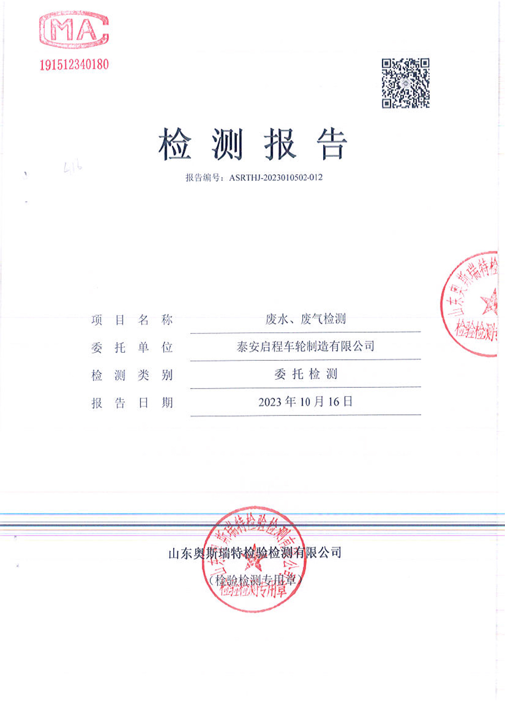 泰安啟程車輪制造有限公司2023年10月份環(huán)境污染物排放檢測報告